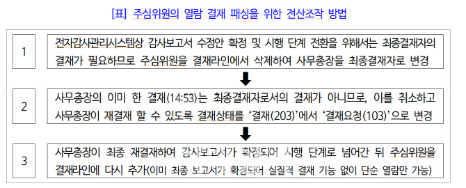 당시 전자감사관리시스템상 감사보고서 수정안 확정 및 시행 단계 전환을 위해서는 최종결재자의 결재가 필요한데 조은석 위원을 결재 라인에서 삭제하고 유병호 사무총장을 최종결재자로 변경한 것이다. 뿐만아니라 결재시간도 임의 조작한 것으로 나타났다.