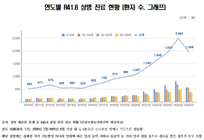 20일 국회 보건복지위원회 소속 서미화 민주당 의원이 건강보험심사평가원으로부터 제출받은 ‘질병 분류별 의료통계’ 자료에 따르면 ‘R41.8 코드’를 주상병으로 진료를 받은 환자 수는 2020년 2만 5991명에서 지난해 4만 842명으로 57% 증가했다. 특히 유아·아동기(0~9세) 연령대의 증가 폭이 가장 컸다. 10대(10~19세) 역시 같은 기간 2배 이상(2.42배) 늘었다.