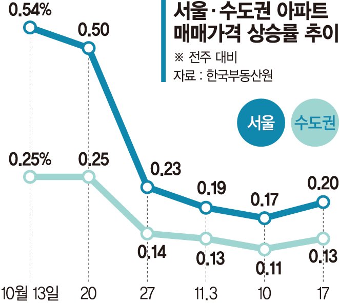 경기는 0.11%, 인천은 0.04% 상승했다. 경기에서는 10·15 대책 영향을 받은 △성남 분당(0.47%) △용인 수지(0.42%) △의왕·광명(0.38%) △화성(0.36%) △과천(0.35%) △성남 수정(0.29%) 순으로 상승률이 높게 나타났다.