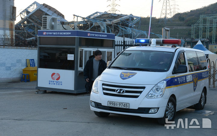 [울산=뉴시스] 배병수 기자 = 7명의 사망자가 발생한 울산화력발전소 보일러 타워 붕괴 사고 관련해 20일 고용노동부와 경찰이 사고현장에서 압수수색을 마치고 나오고 있다.2025.11.20.bbs@newsis.com. |
