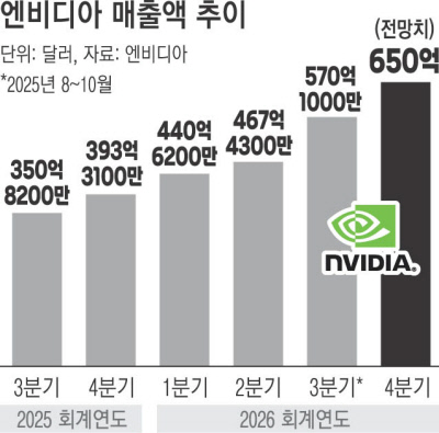 업계에선 엔비디아 실적을 AI 열풍의 지속 가능성을 가늠하는 지표로 본다. 엔비디아는 4분기에도 성장세가 이어져 650억달러의 매출을 기록할 것으로 내다봤다.