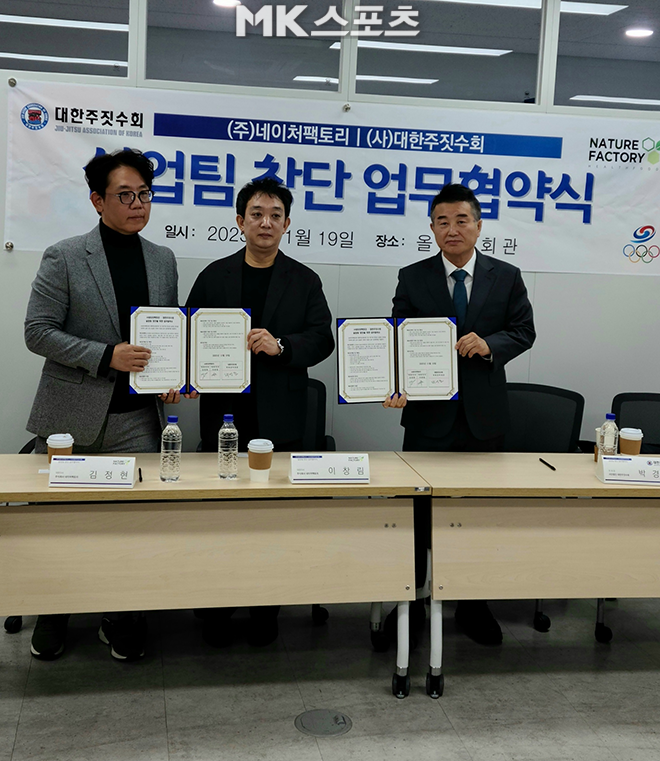 (주)네이처팩토리(대표 김정현 이창림)와 (사)대한주짓수회(부회장 박경준)가 2025년 11월19일 서울특별시 대한체육회 올림픽회관에서 MOU 체결식을 열고 ‘실업팀 창단을 위한 업무협약서’를 교환했다. 사진(서울 방이동)=강대호 기자 |