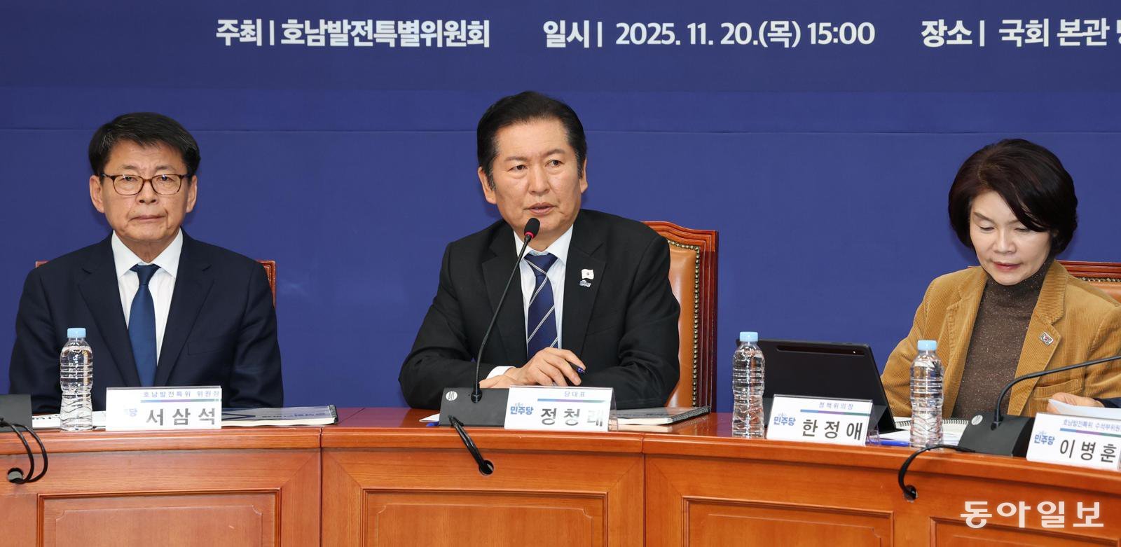 더불어민주당 정청래 대표가 20일 서울 여의도 국회에서 열린 호남발전과제 보고회에서 발언하고 있다. 민주당은 이날 당 대표와 최고위원 선출에 당원 1인 1표제를 적용하는 안에 대한 전 당원 의견 수렴 투표 결과를 발표했다. 왼쪽부터 서삼석 호남발전특별위원장과 정 대표, 한정애 정책위의장. 이훈구 기자 ufo@donga.com |