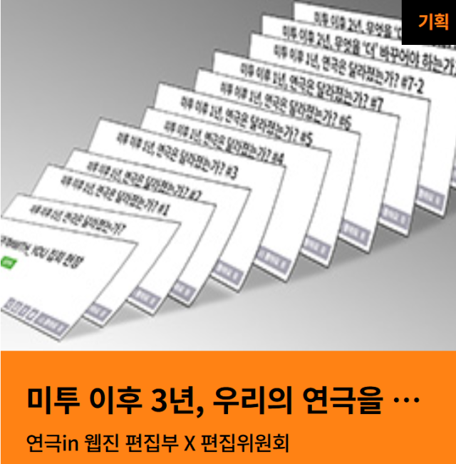 나 역시 연극계 미투 이후 연극계를 구성하고 있는 다양한 사람들과 연극계와 자기 자신의 변화에 대해 이야기하는 기획 기사 "미투 이후 1년, 연극은 달라졌는가?"의 관객 좌담회 패널로 초대된 적이 있다. <연극in>에 실리는 것은 연극을 처음 보기 시작했던 고등학생 시절부터 나의 오랜 꿈이었기에 그 초대가 부담스러웠던 만큼이나 기뻤던 기억이 난다.