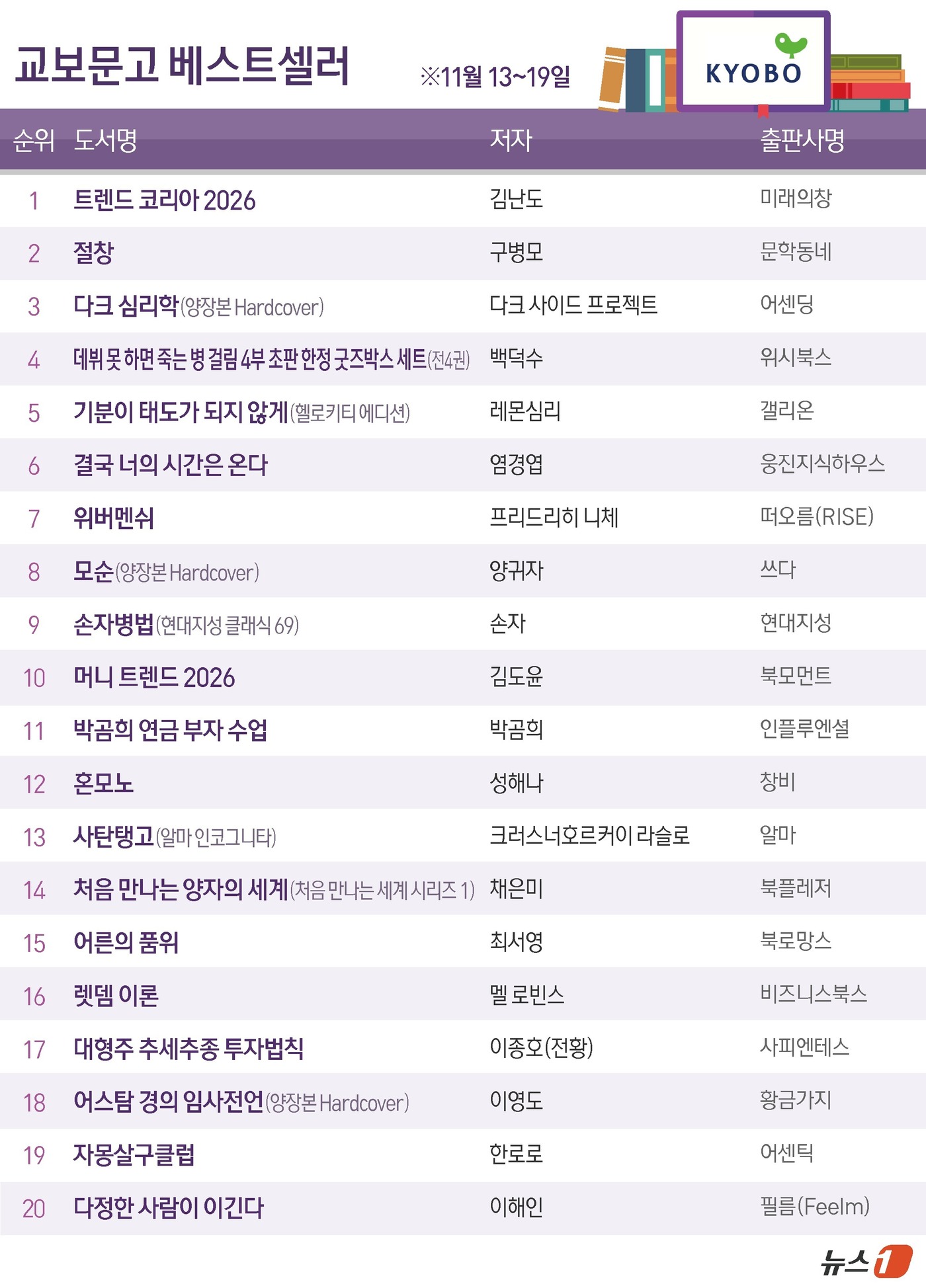 교보문고 최신 주간(11월 13~19일) 종합 베스트셀러