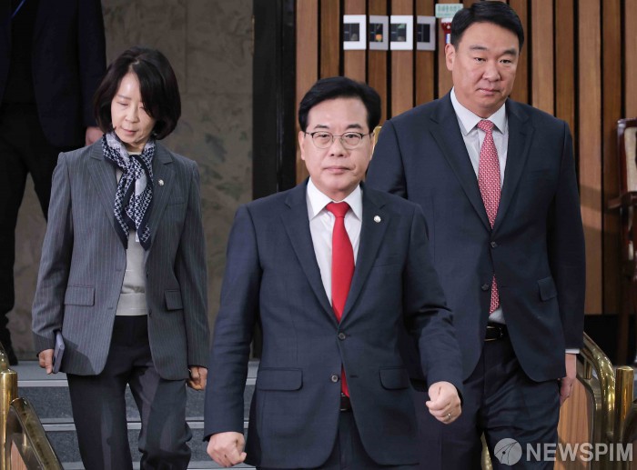 [서울=뉴스핌] 윤창빈 기자 = 송언석 국민의힘 원내대표가 21일 서울 여의도 국회에서 열린 원내대책회의에 참석하고 있다. 2025.11.21 pangbin@newspim.com