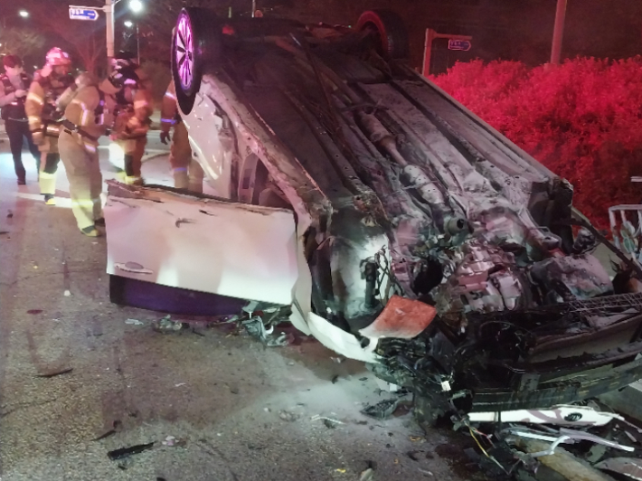 21일 오전 2시쯤 전북 전주시 덕진구 덕진동의 한 도로에서 승용차가 인도 펜스를 들이받아 전복됐다.