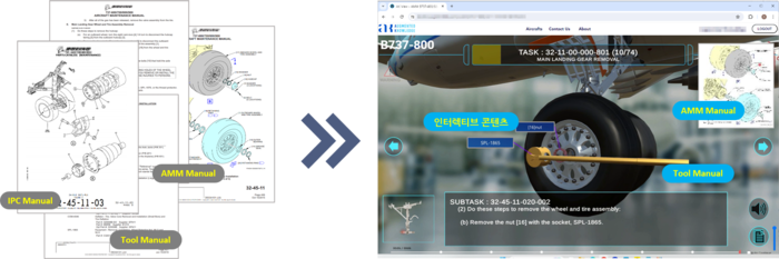 ▲정비 매뉴얼 AI 분석 및 절차 자동 구조화 ▲ 매뉴얼 절차와 가상 3D 디지털 트윈 객체 연동 ▲ 항공기·전기차 등 다중 산업 정비 콘텐츠 제작 ▲클라우드 기반 지속 업데이트 및 확장 지원 등이다.