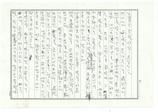 시집 한 권을 읽고 단 한 문장이라도 가슴에 닿으면 '성공'이라고 합니다. 흔하지 않지만 드물지도 않은 그 기분 좋은 성공을 나누려 씁니다. '생각을 여는 글귀'에서는 문학 기자의 마음을 울린 글귀를 격주로 소개합니다.김자야 여사가 이동순 시인에게 보낸 자필 편지. 창비 제공 |