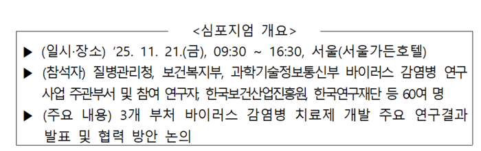 다부처 감염병 치료제 연구개발(R&D) 성과교류 심포지엄 개요(자료=질병관리청) |