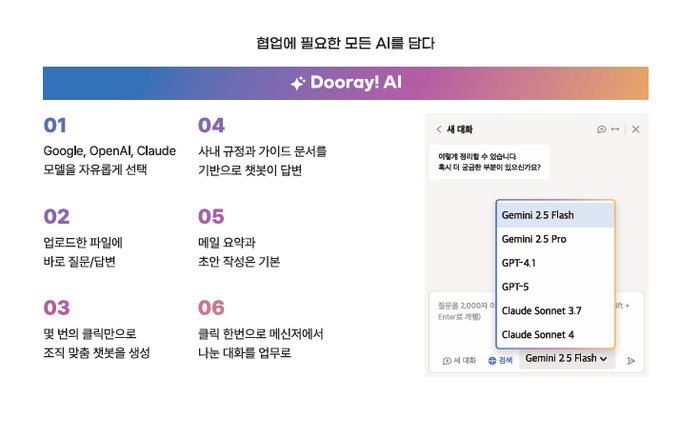 2024년 협업솔루션에 AI를 결합한 'Dooray! AI'를 출시해, 고객사의 AX에 박차를 가하기 시작했다. 메일/메신저/위키 등 두레이가 제공하던 다양한 협업 기능들을 AI와 연동해 강력한 편의성을 갖췄을 뿐만 아니라 글로벌 LLM인 ChatGPT, Gemini, Claude 등 멀티LLM(거대언어모델) 전략을 활용해 고객사의 보안 환경과 업종에 따라 맞춤형 기술 서비스를 제공한다.