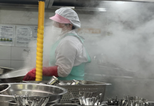 광주의 한 학교 조리실에서 땀과 증기로 젖은 조리 노동자가 뜨거운 열기 속에서 식기를 세척하고 있다. 학교비정규직노조 제공 |
