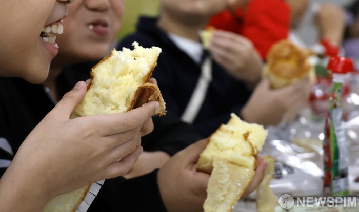 한 초등학교 급식실에서 학생들이 배식받은 빵과 음료로 점심을 먹고있다. [사진=뉴스핌DB] |