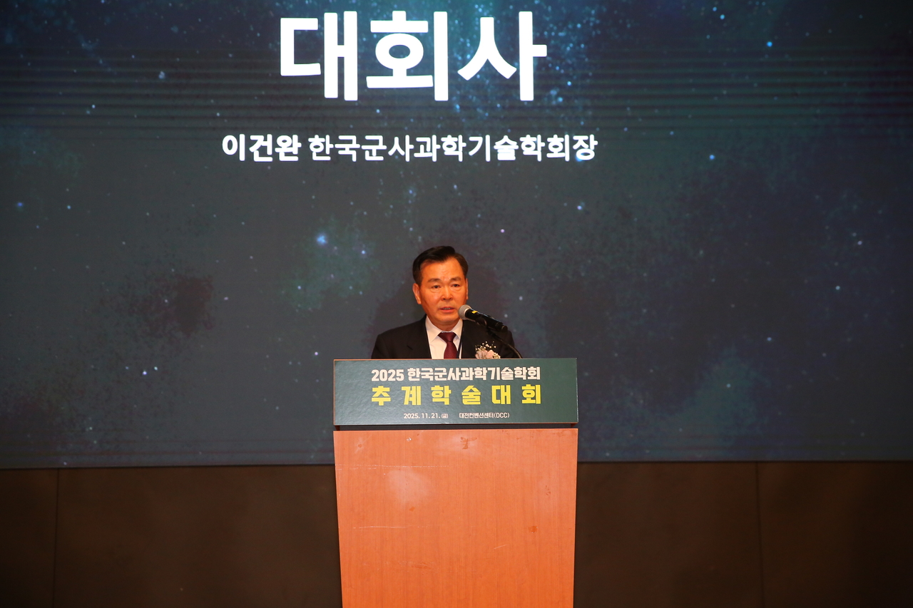 이건완 한국군사과학기술학회장이 ‘2025 한국군사과학기술학회 추계학술대회’ 대회사를 하고 있다.[ADD 제공] |