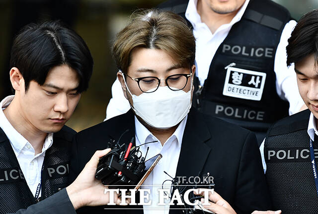 '음주 뺑소니와 운전자 바꿔치기 등 혐의'를 받는 가수 김호중이 2024년 6월 31일 오전 서울 강남구 서울강남경찰서에서 서울중앙지방검찰청으로 송치되고 있다. /박헌우 기자 |