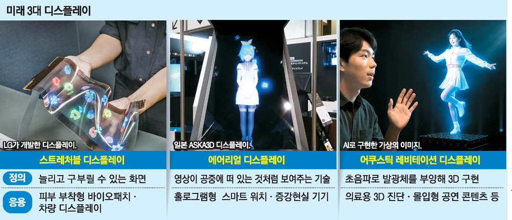 원리는 이렇다. 초음파 트랜스듀서(Transducer)라는 장치가 강력하고 정밀한 음파를 방출→음파들이 서로 간섭하면서 '정재파(Standing Wave)' 형성→압력 노드라고 불리는 특정 지점에서 소리 압력에 따라 물체가 중력과 균형을 이루며 부상→떠오른 작은 스트레처블 디스플레이가 스스로 영상을 발산→이를 소프트웨어로 제어해 입체적인 홀로그램을 구현하는 순이다.