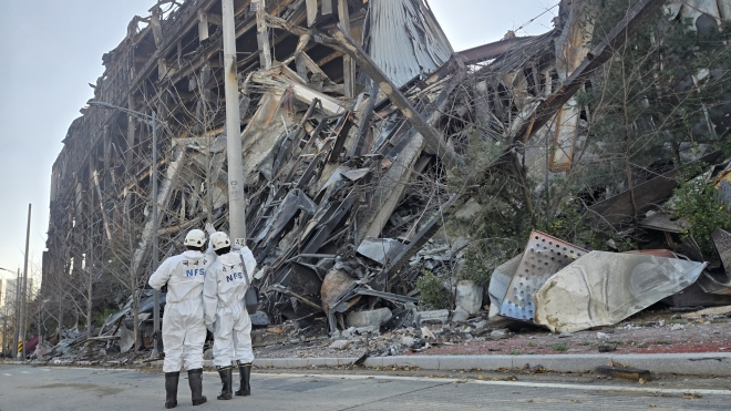 21일 충남 천안시 이랜드패션 물류센터 화재 현장에서 합동감식 참여자들이 무너진 물류센터를 확인하고 있다. 이종익 기자 |