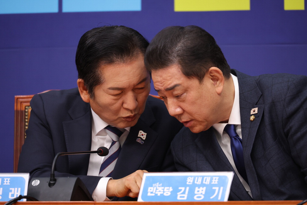 더불어민주당의 정청래 대표(왼쪽)와 김병기 원내대표가 21일 국회에서 열린 최고위원회의에서 귀엣말을 나누고 있다. 연합뉴스 |