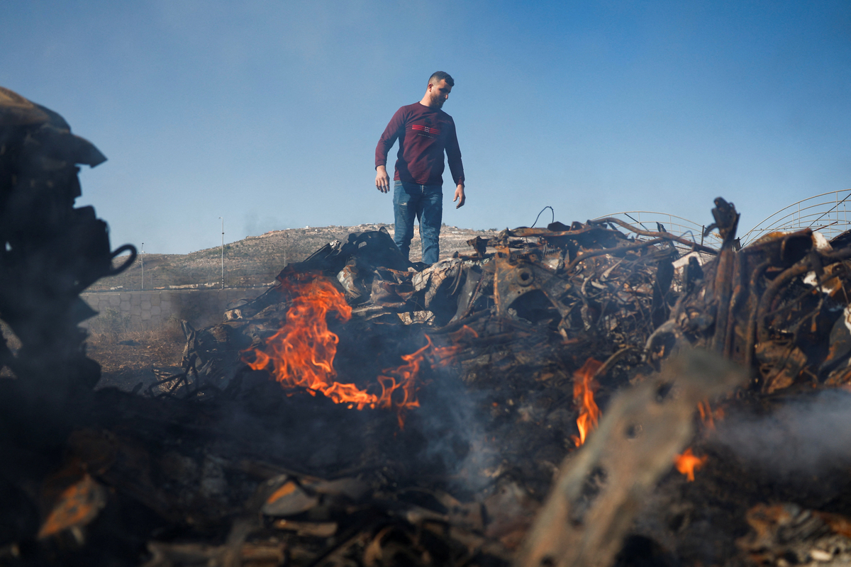 21일(현지시간) 이스라엘이 점령한 요르단강 서안지구 후와라에서 이스라엘 정착민들의 공격으로 불탄 차량 근처에 팔레스타인인이 서 있다. 로이터연합뉴스 |