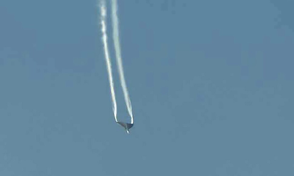 21일 두바이 알막툼 국제공항에서 열린 2025 두바이 에어쇼 현장에서 비행기가 추락하고 있다. 타스 연합뉴스 |