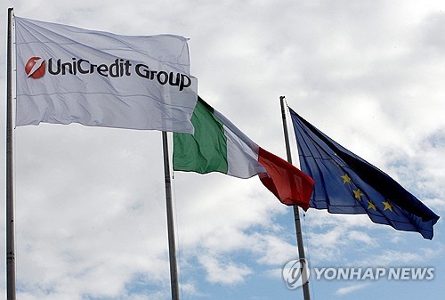 로마 우니크레디트 사옥에 나란히 휘날리는 이탈리아 2위 은행 우니크레디트와 이탈리아 국기, EU기 [로이터 연합뉴스 자료사진. 재판매 및 DB 금지] |