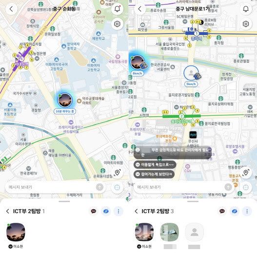 특히 단체 모임에서 유용했다. 다수가 함께하는 점심 약속에서 누가 어디쯤 오는지 실시간으로 확인하니 모임 진행이 수월했다. 자녀의 안전 귀가나 홀로 계신 부모님의 위치를 확인하는 등 가족의 안전 확인에 유용하게 활용될 수 있을 것 같았다.