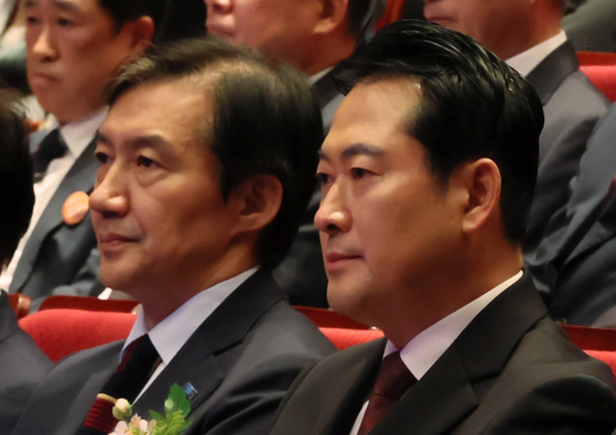 지난달 16일 조국 당시 조국혁신당 비대위원장과 장동혁 국민의힘 대표가 경남 창원시 3·15아트센터에서 열린 제46주년 부마민주항쟁 국가기념식에 참석한 모습. 〈자료사진=연합뉴스〉 |
