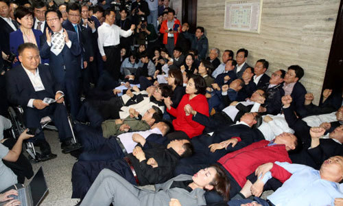 2019년 4월 26일 당시 나경원 원내대표 등 자유한국당 의원들이 사법개혁특위가 열리는 국회 회의실 앞에 드러누워 이상민 위원장 등 참석자 진입을 막는 모습. 연합뉴스 |