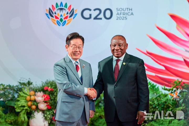 [요하네스버그=뉴시스] 최동준 기자 = 이재명 대통령이 22일(현지 시간) 남아프리카공화국 요하네스버그 엑스포 센터에서 열린 G20 정상회의에 앞서 시릴 라마포사 남아공 대통령과 악수를 하고 있다. (공동취재) 2025.11.22. photocdj@newsis.com |