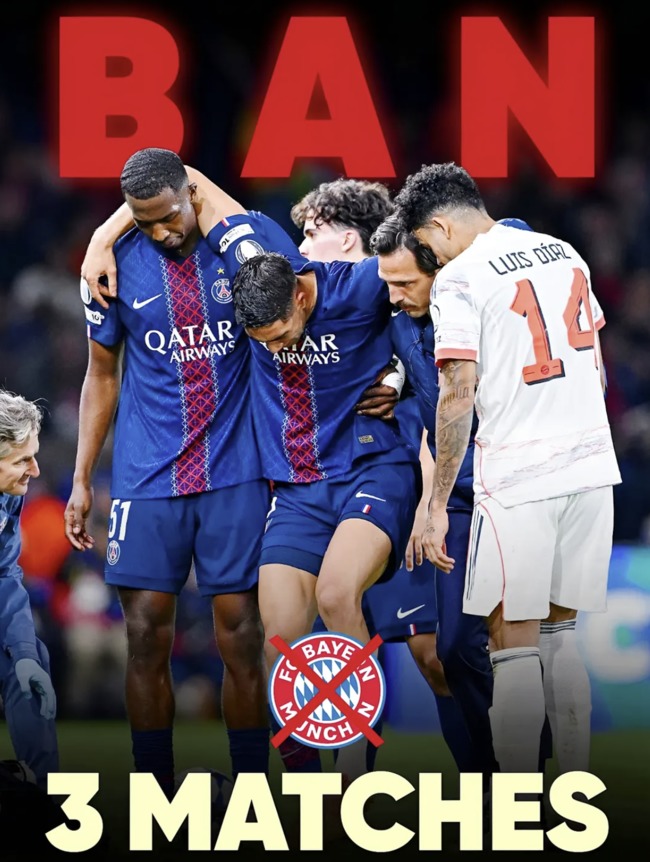뮌헨 소식을 전하는 '바바리안 풋볼 웍스'는 22일(한국시간) "디아스는 파리 생제르맹(PSG)전 레드카드 징계로 3경기 출전 정지를 받았다. 당초 1경기 정지를 예상했지만, 이번 판정은 훨씬 무겁게 내려졌다. 뮌헨은 유럽축구연맹(UEFA) 사무국은 서면 설명을 요청했으며, 이번 결정에 대해 항소할 계획이다"라고 보도했다.