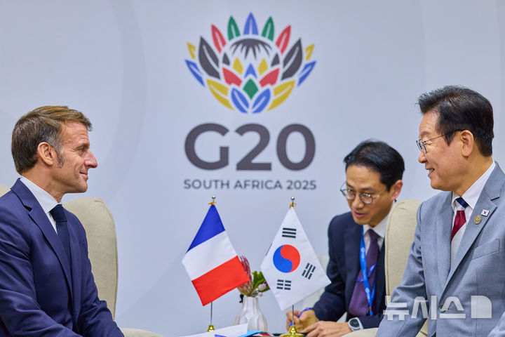 [요하네스버그=뉴시스] 최동준 기자 = 이재명 대통령과 에마뉘엘 마크롱 프랑스 대통령이 22일(현지 시간) 남아프리카공화국 요하네스버그 엑스포 센터 양자회담장에서 한-프랑스 정상회담 기념촬영을 하고 있다. (공동취재) 2025.11.23. photocdj@newsis.com |