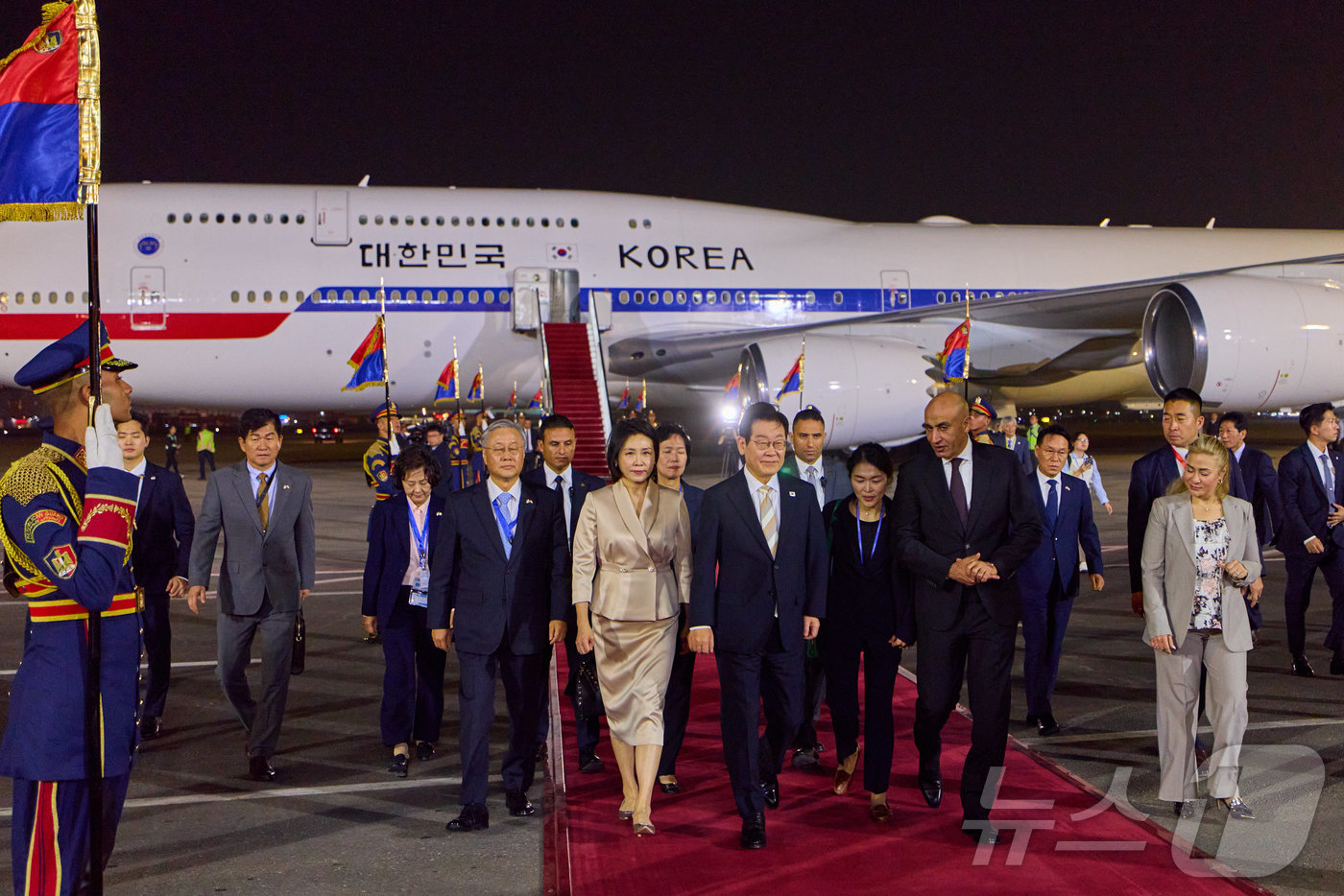 (서울=뉴스1) 이재명 기자 = 이집트를 공식 방문한 이재명 대통령과 김혜경 여사가 19일(현지시간) 카이로 국제공항에서 이동하고 있다. (대통령실 제공. 재판매 및 DB 금지) 2025.11.23/뉴스1