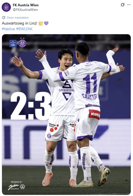 아우스트리아 빈은 3-2로 이겨 최근 리그 2연승으로 5위(승점 22)에 올랐다.