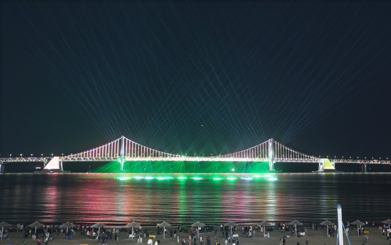 22일 오후 부산 광안리해수욕장에서 열린 ‘광안리 드론 X 레이저쇼’ 특별공연에서 광안대교를 배경으로 화려한 레이저쇼가 펼쳐지고 있다.