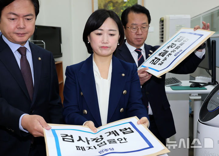 [서울=뉴시스] 김명년 기자 = 더불어민주당 문금주·김현정·백승아 원내대변인이 14일 서울 여의도 국회 의안과에서 검찰청법·검사징계법개정안을 제출하고 있다.(공동취재) 2025.11.14. photo@newsis.com |