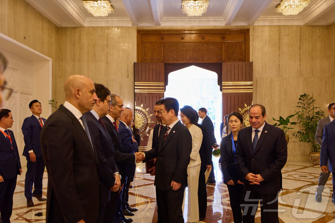 (서울=뉴스1) 이재명 기자 = 이집트를 공식 방문 중인 이재명 대통령이 20일(현지시간) 카이로 대통령궁에서 열린 공식 환영식에서 환영 인사들과 악수를 하고 있다. (대통령실 제공. 재판매 및 DB 금지) 2025.11.23/뉴스1