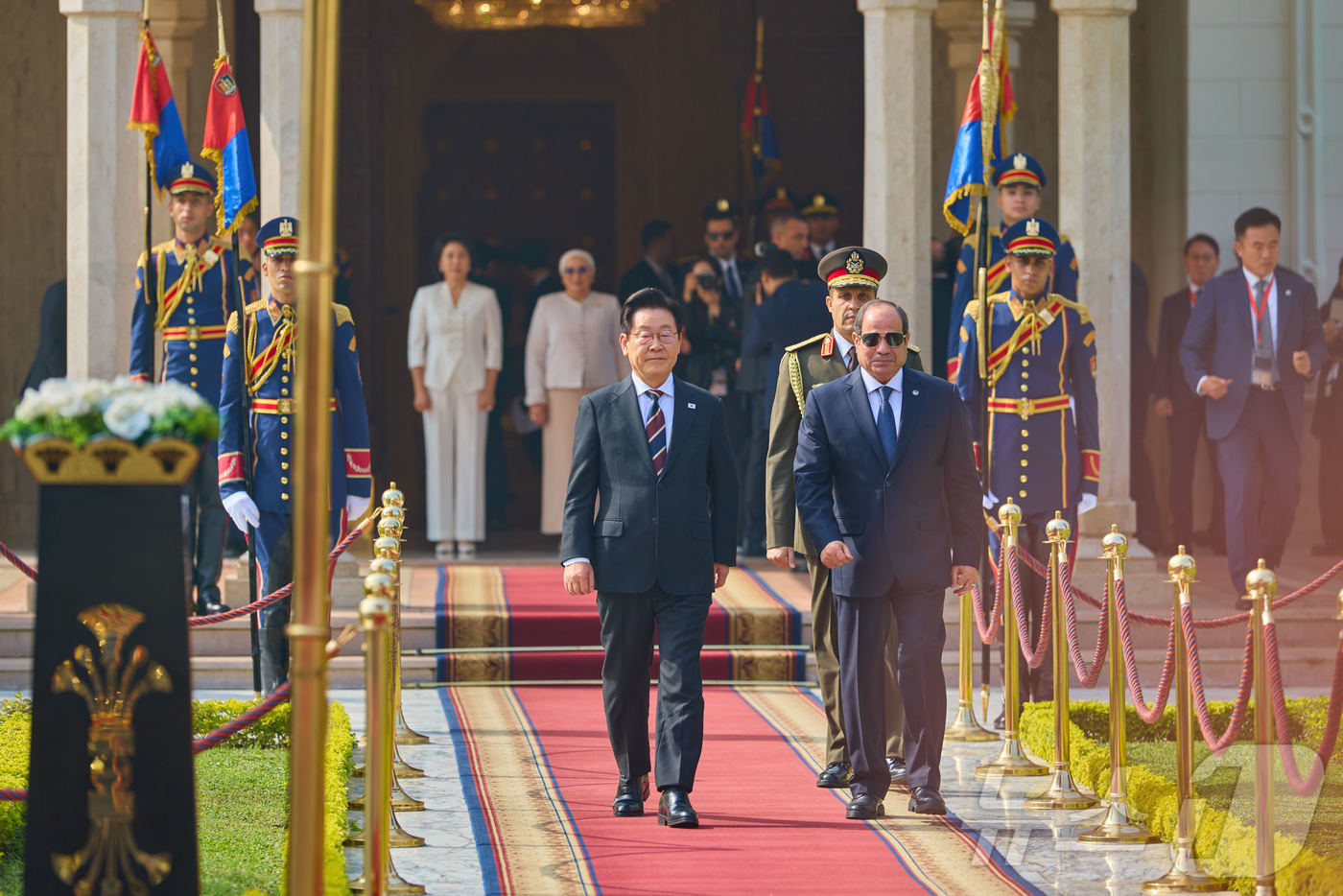 (서울=뉴스1) 이재명 기자 = 이집트를 공식 방문 중인 이재명 대통령이 20일(현지시간) 카이로 대통령궁에서 열린 공식 환영식에서 압델 파타 알시시 이집트 대통령과 의장대를 사열하고 있다. (대통령실 제공. 재판매 및 DB 금지) 2025.11.23/뉴스1