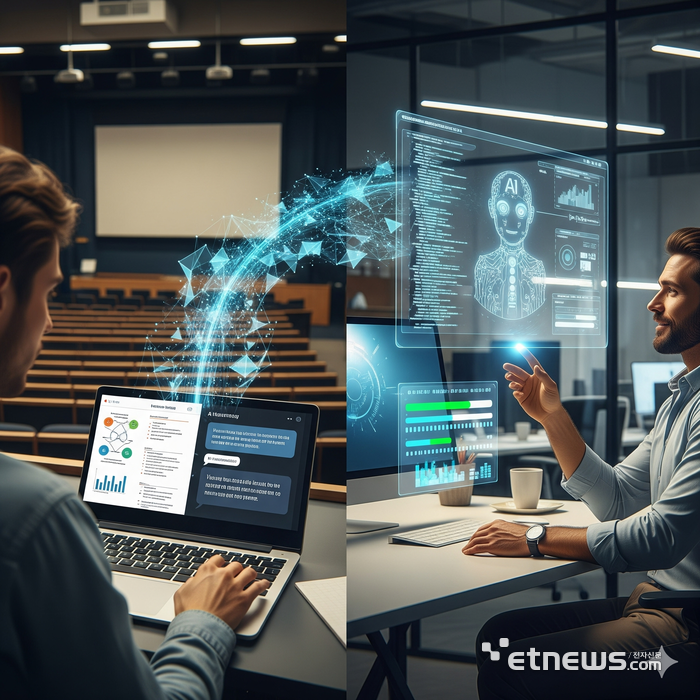 서울 성북구 국민대 강의실. 수업이 한창이지만 학생들의 손은 키보드 위에서 바쁘게 움직이지 않는다. 대신 시선은 좌우로 노트북 화면을 쉼 없이 오간다. 왼쪽 창에는 복잡한 강의안이, 오른쪽 창에는 실시간 교수의 설명을 받아 적으며 요약해 주는 생성형 AI 챗봇이 텍스트를 쏟아낸다.