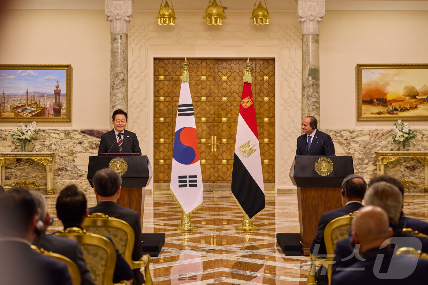 (서울=뉴스1) 이재명 기자 = 이집트를 공식 방문 중인 이재명 대통령이 20일(현지시간) 카이로 대통령궁에서 압델 파타 알시시 대통령과 한·이집트 공동언론발표를 하고 있다. (대통령실 제공. 재판매 및 DB 금지) 2025.11.23/뉴스1