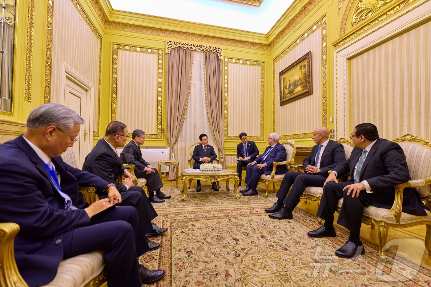 (서울=뉴스1) 이재명 기자 = 이집트를 공식 방문 중인 이재명 대통령이 20일(현지시간) 카이로대학교에서 무함마드 사미 압델사덱 카이로대학교 총장과 사전환담을 하고 있다. (대통령실 제공. 재판매 및 DB 금지) 2025.11.23/뉴스1