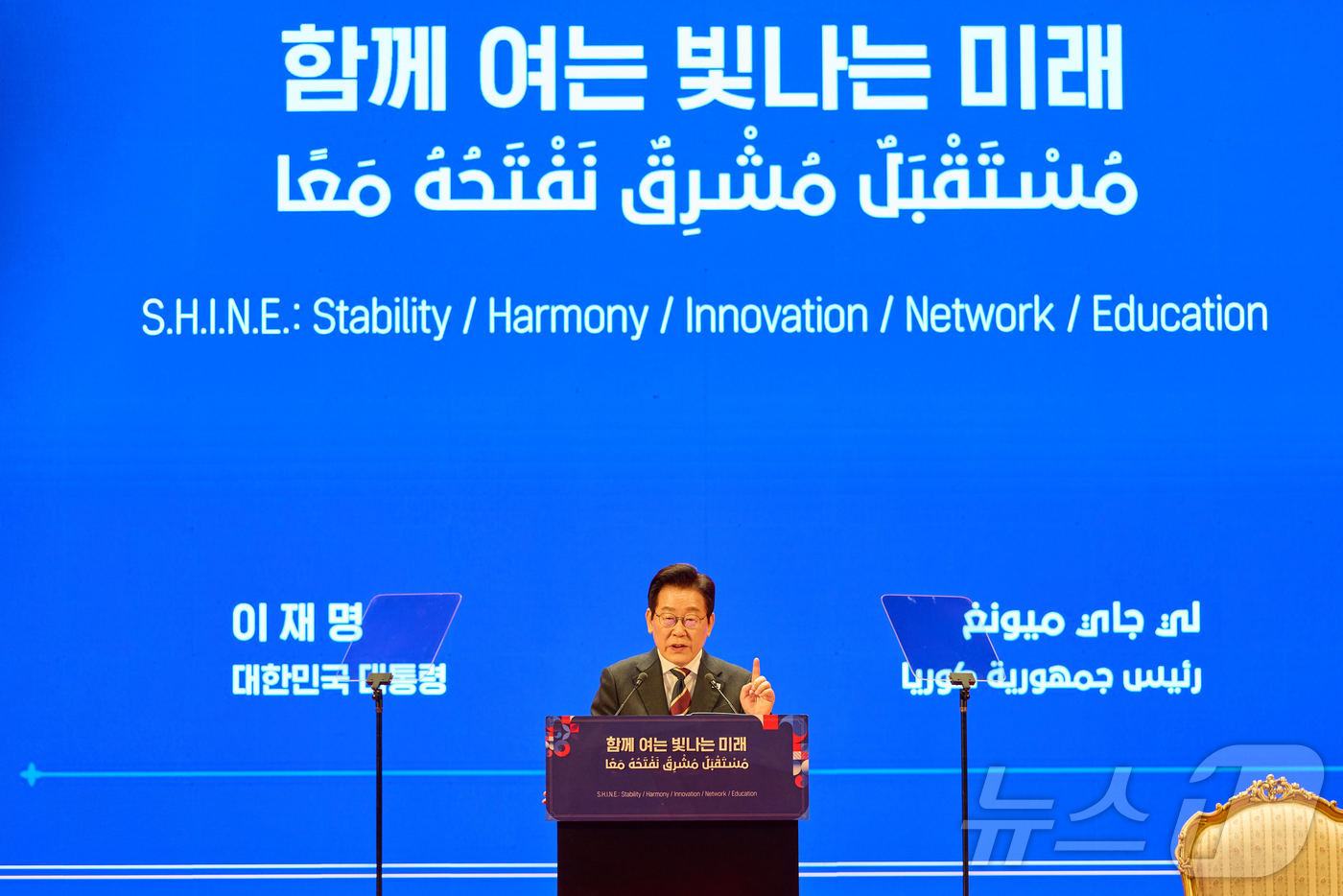 (서울=뉴스1) 이재명 기자 = 이집트를 공식 방문 중인 이재명 대통령이 20일(현지시간) 카이로대학교에서 '함께 여는 빛나는 미래'라는 주제로 연설하고 있다. (대통령실 제공. 재판매 및 DB 금지) 2025.11.23/뉴스1