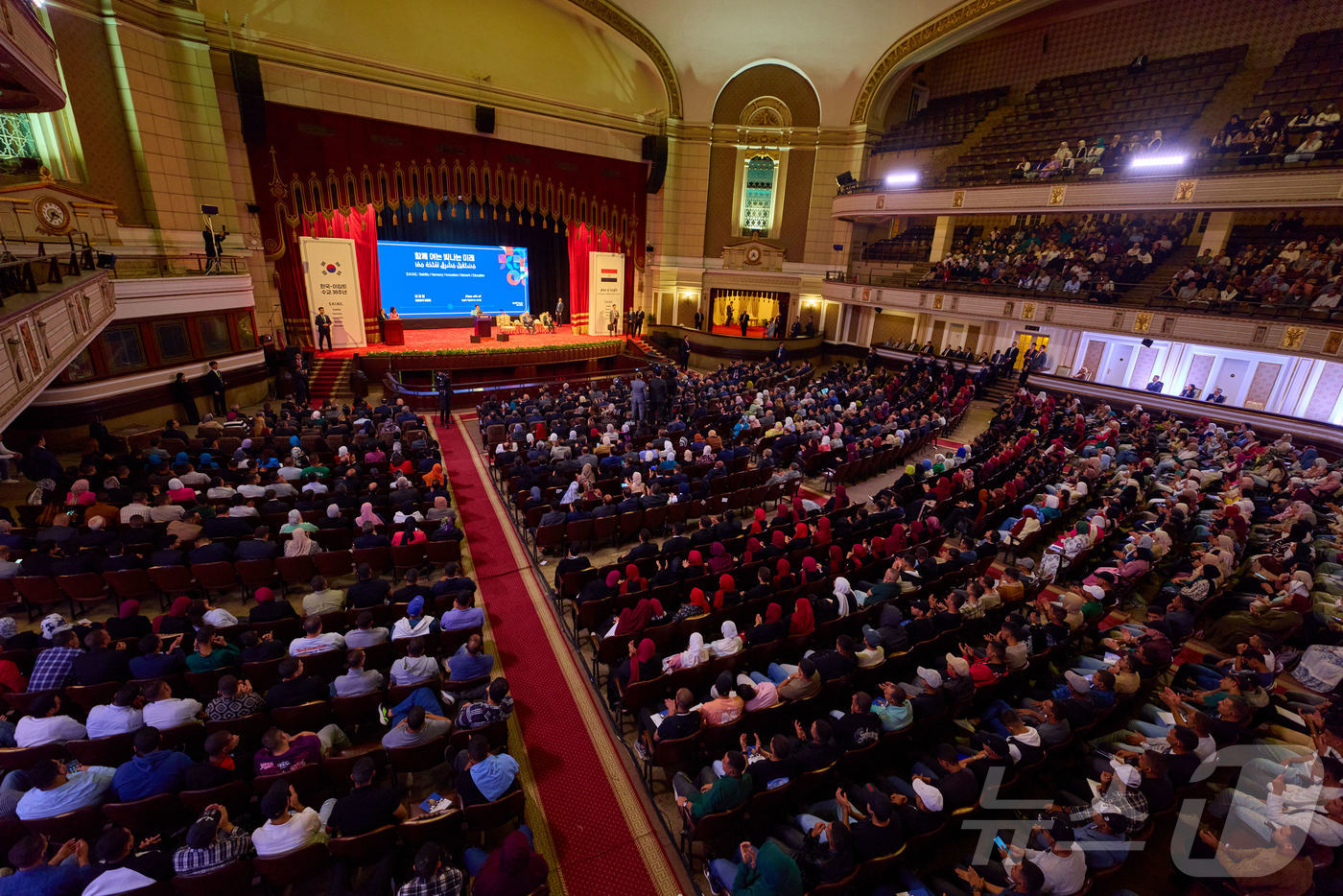(서울=뉴스1) 이재명 기자 = 이집트를 공식 방문 중인 이재명 대통령이 20일(현지시간) 카이로대학교에서 '함께 여는 빛나는 미래'라는 주제로 연설하고 있다. (대통령실 제공. 재판매 및 DB 금지) 2025.11.23/뉴스1