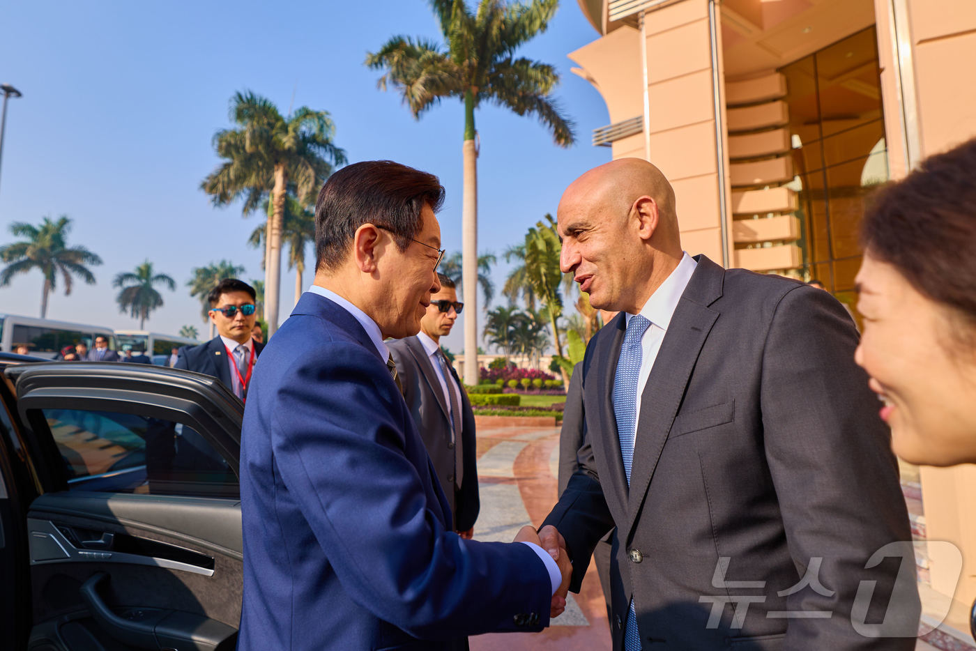 (서울=뉴스1) 이재명 기자 = 이집트 공식 방문 일정을 마친 이재명 대통령이 21일(현지시간) 카이로 국제공항에서 남아프리카공화국 요하네스버그로 출발하기 전 환송인사와 악수하고 있다. (대통령실 제공. 재판매 및 DB 금지) 2025.11.23/뉴스1