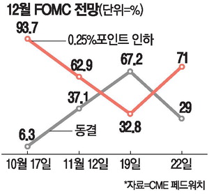 22일(현지시간) 시카고상품거래소(CME) 페드워치에 따르면 12월 FOMC에서 금리를 내릴 확률은 71%로 뛰어올랐다. 동결 전망은 29%다. 전날만 해도 10월 FOMC에서 다수의 연준 위원들이 추가 인하에 반대했다는 의사록이 공개되며 금리를 낮출 확률이 30%대에 불과했지만 존 윌리엄스 뉴욕 연방준비은행(연은) 총재가 "가까운 시기에 기준금리를 추가 조정할 여지가 있다"고 언급하자 기대감이 2배 이상 급등한 것이다.