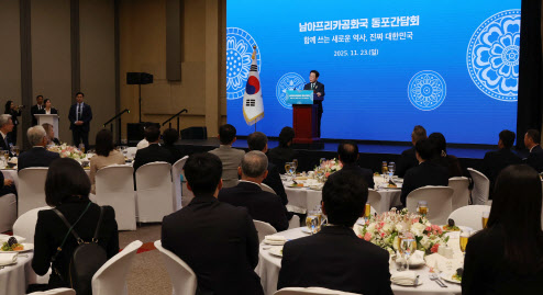이재명 대통령이 23일(현지시간) 남아프리카공화국 요하네스버그 샌튼 컨벤션센터에서 열린 동포 오찬간담회에서 인사말을 하고 있다. (사진=연합뉴스) |