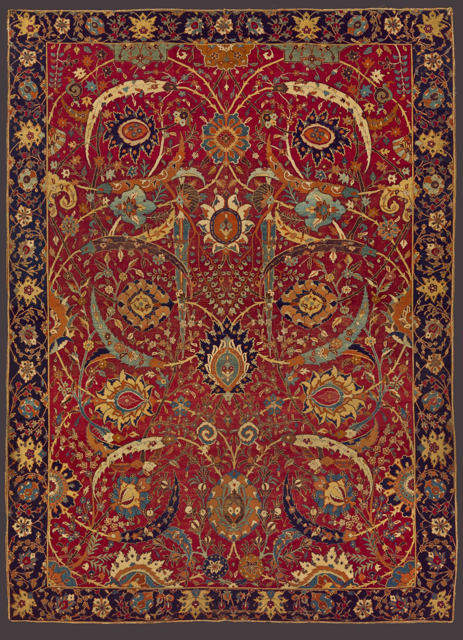 가장자리에 톱니가 돋은 이파리들의 문양이 낫처럼 날카롭게 뻗어 있다. 이파리 사이에 수놓인 이채로운 잔꽃과 덩굴무늬. 군사적 힘과 종교적 권위를 바탕으로 중세 페르시아를 장악했던 사파비 제국(1501∼1732)의 왕좌용 카펫이다. 길이 2.7m인 이 짙붉은 카펫은 곳곳에 군청색, 미색 등이 어우러지며 생기가 넘친다.