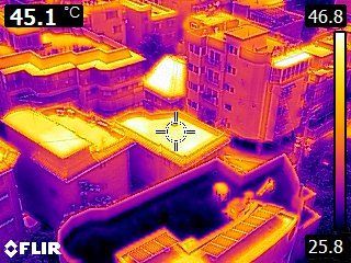 열화상 카메라로 본 도시의 옥상. 아래쪽 검정색 부분은 쿨루프를 시공한 옥상이다. 아시아경제DB. |
