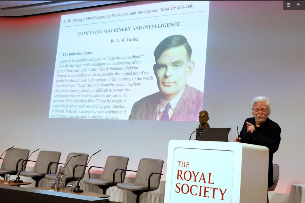 튜링테스트 공개 75돌을 맞아 지난달 2일 런던 영국왕립협회에서 열린 학술대회에서 튜링상 수상자이자 컴퓨터 개발 선구자인 앨런 케이가 기조연설에서 튜링테스트의 의미와 한계를 발표했다. 세계컴퓨터협회(ACM) 제공 |