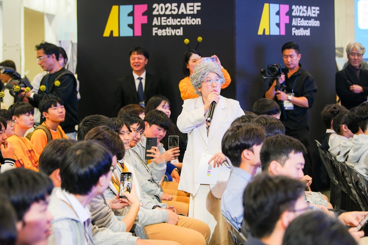 ‘2025 대한민국 AI교육 페스티벌’에서 소통왕 말자할매(개그우먼 김영희)가 AI 주제 토크 콘서트를 진행하고 있다.[한국과학창의재단 제공] |