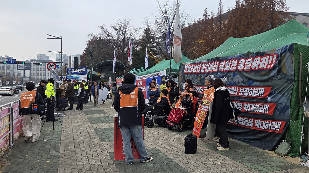 ▲ 국회 앞에서 권리 예산 증액 촉구하는 전장연 활동가들